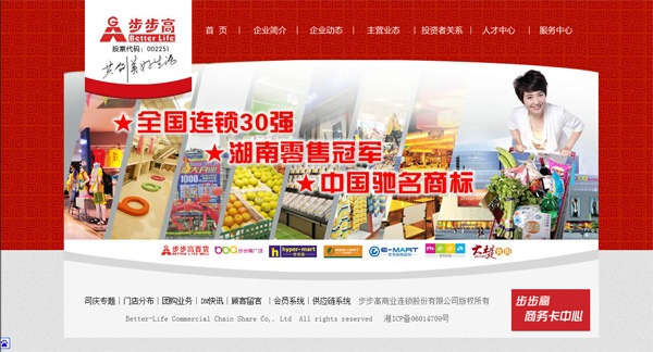 步步高(002251)商業連鎖股份有限公司始創于1995年(nián),緻力于成長爲中國(guó)領先的商業及服務業運營商,公司于2008年(nián)6月19日(rì)在深圳證券交易所上市,股票代碼爲002251。目前擁有步步高超市,步步高百貨(廣場),步步高雲猴網,步步高置業(步步高·新天地),步步高電器城(chéng),太楚餐飲,彙米巴便利店(diàn)等業态。截至2014年(nián)底,多業态門(mén)店(diàn)已遍布湘、贛、川、渝、桂、滇等省市。步步高(002251)多業态、線上線下齊頭并進。由國(guó)際著名鋼琴家、聯合國(guó)和平使者郎朗代言的商業地産“步步高·新天地”品牌目前已經有十多個大(dà)型綜合體(tǐ)在動工(gōng),其中70萬方純商業,擁有太空飛行館、真冰滑冰場、酷車樂園、雲頂星河樂園等體(tǐ)驗性極強的項目的長沙梅溪湖新天地是集團旗下最大(dà)的綜合體(tǐ)。2013年(nián)12月26日(rì)成立的雲猴網(步步高商城(chéng)),緻力于打造中國(guó)第一的O2O生(shēng)活平台.