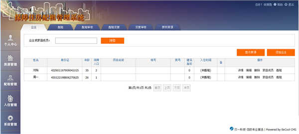 配租管理(lǐ)中包含業主及家庭成員(yuán)增删改查、配租、配租審核、配租變更、變更審核及授權房(fáng)源等功能。