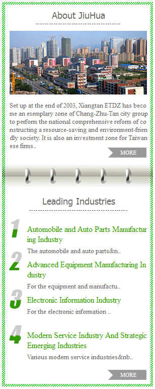 湘潭九華經濟技術(shù)開發區地處長株潭核心區域,總規劃面積138平方公裡(lǐ),總人(rén)口13.8萬人(rén),南(nán)距湘潭市中心5公裡(lǐ),北距長沙市中心27公裡(lǐ),是長株潭城(chéng)市群國(guó)家“資源節約型和環境友好型社會”綜合配套改革試驗區的五大(dà)示範區之一。獲評爲:中國(guó)汽車及零部件(jiàn)産業集群50強、湖南(nán)省首個創建“金融安全區”的經濟園區、2011年(nián)湖南(nán)省新型工(gōng)業化考核中位列第三、2011年(nián)湖南(nán)省新型工(gōng)業化一等獎、全國(guó)機(jī)電一體(tǐ)化特色産業基地。 爲加強國(guó)際性展示、促進國(guó)際性招商而定制了九華經濟開發區英文版網站(zhàn),該網站(zhàn)除作(zuò)爲九華經濟開發區的國(guó)際名片之外,還(hái)集新聞發布、職能部門(mén)介紹、企業展示、招商優勢展示等功能于一體(tǐ)。