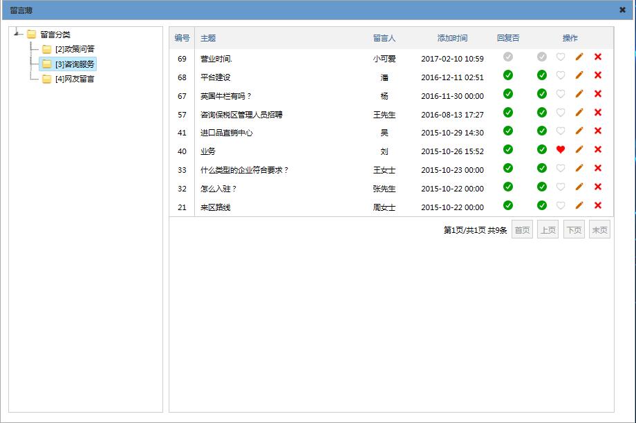 4. 相(xiàng)關部門(mén)的管理(lǐ)員(yuán)對留言進行審核、設爲常見(jiàn)問(wèn)題、回複、删除等操作(zuò)