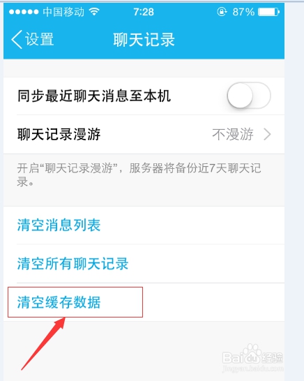 第四步進入“聊天記錄”頁面後,我們找到“清空緩存數據”:
