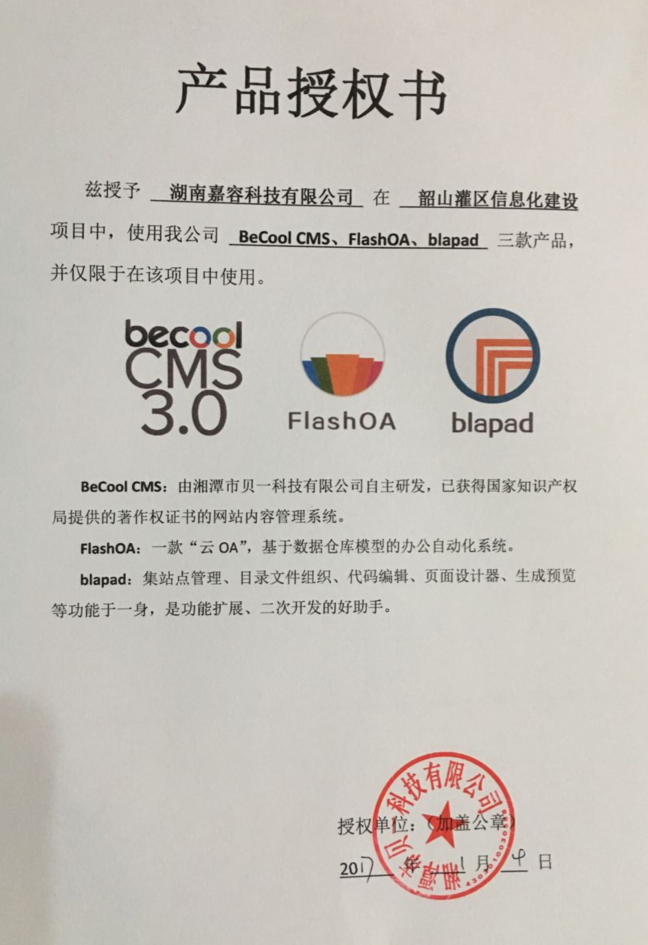 近日(rì),貝一科(kē)技核心産品商業化又添喜訊,湖南(nán)華水科(kē)技、湖南(nán)嘉容科(kē)技和湖南(nán)六建集團三家公司,分(fēn)别取得(de)在韶山(shān)灌區2016年(nián)度續建配套與節水改造項目信息化建設工(gōng)程項目中,貝一科(kē)技幾大(dà)核心産品(含BeCool CMS、FlashOA、blapad - 布拉編輯器) 的商業授權。