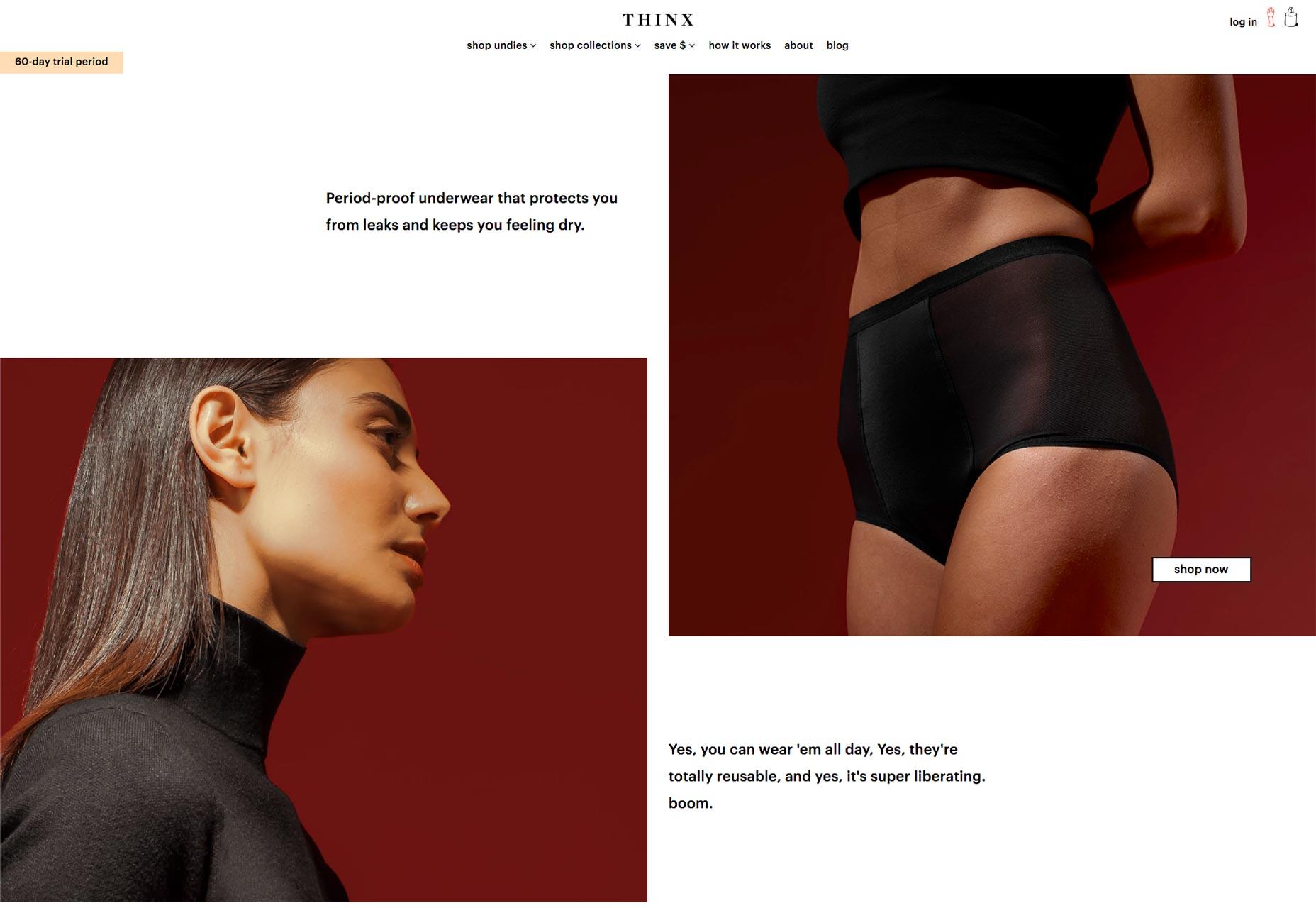 Thinx 這個案例我非常喜歡,并且經常會用到,因爲它證明了設計(jì)師(shī)并不一定非得(de)靠高飽和度的霓虹色來(lái)創造高對比度的配色。即使是兩種平衡的顔色,也能讓整個設計(jì)脫穎而出。