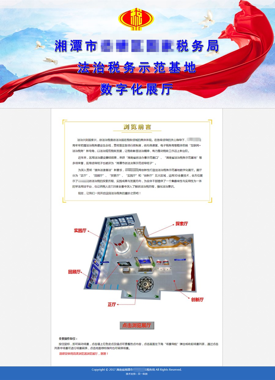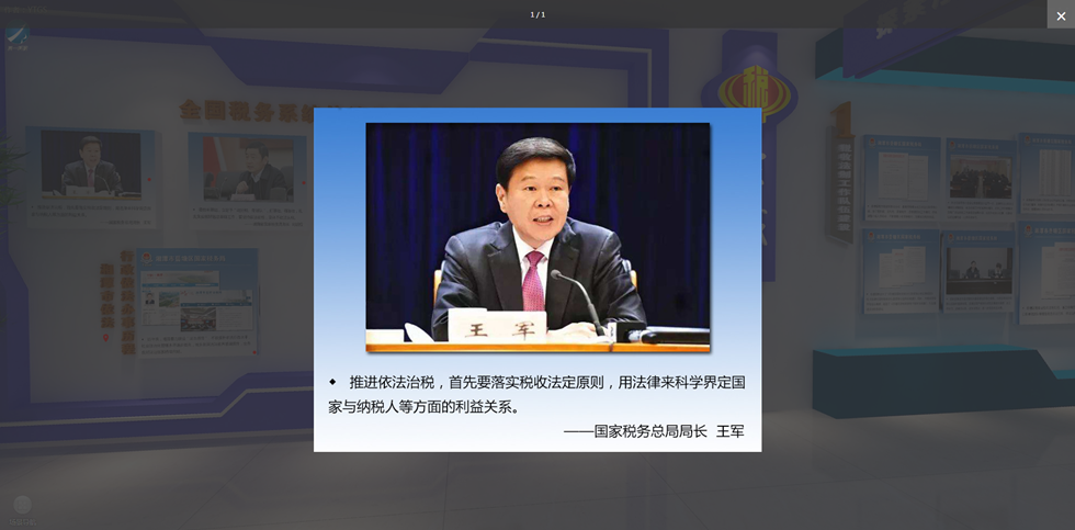爲深入貫徹“誰執法誰普法”新要求,XXX國(guó)稅局創新性打造出法治稅務示範基地數字化展廳。展廳分(fēn)爲“正廳”、“回顧廳”、“探索廳”、“實踐廳”和“創新廳”五大(dà)區域,運用3D全景技術(shù),全方位展示了XXX國(guó)稅依法治稅的探索曆程、實踐成果與發展方向,爲全體(tǐ)幹部提供了一個集趣味性與實用性爲一體(tǐ)的學法用法平台,也讓納稅人(rén)在720度全景中深入了解依法治稅曆程,強化法治意識。